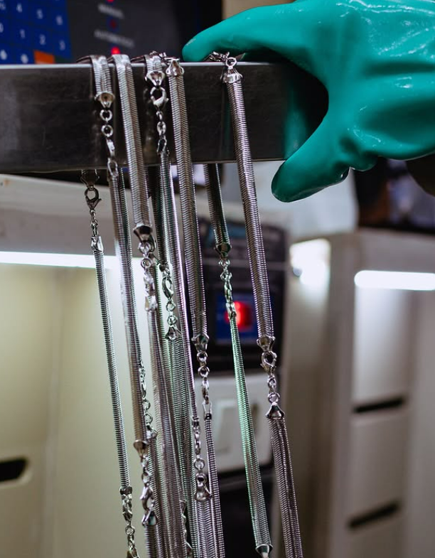 O banho de semijoias é realizado por meio de um processo chamado galvanoplastia. Nele, a peça metálica base recebe uma camada de metal nobre através de corrente elétrica.